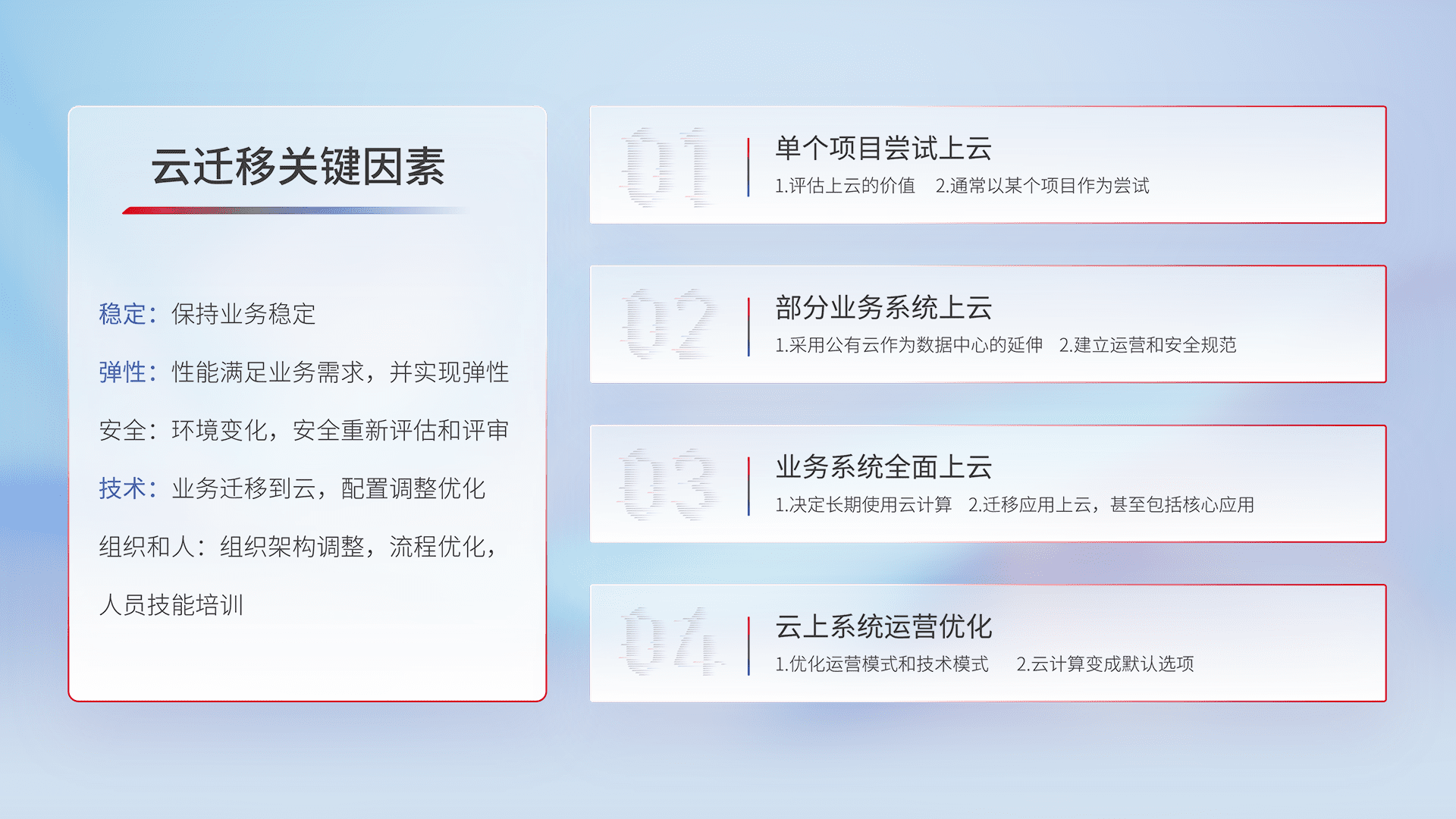 结合实际业务,,,,从规划设计、、云平台选型、、云原生改造、、、数据迁移、、、、集成交付,,,迁移全过程为客户识别最佳上云路径,,,做好风险识别管理,,设计网络架构、、、身份权限、、安全审计合规、、操作审计、、日志审计、、、监控告警策略、、、多站点容灾设计等,,,,对云上基础设施进行整体规划,,,,提升IT治理水平,,以满足弹性、、、、高可用、、高性能的需求。。。