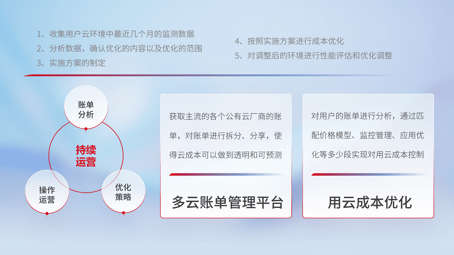 通过多云纳管,,,以统一的资源数据模型把客户的云资源进行抽象和封装,,,,进而实现对多云资源的统一操作,,,,保障云资源管理的可靠性、、、稳定性与可用性。。。。量身定制化运维内容,,配置、、开发运维、、、、补丁管理、、、、备份、、、、监控、、、、认证和访问管理、、审计和日常巡检等,,,,保障在用云过程中的可靠度,,,稳定度以及高可用率。。。